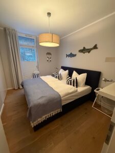 Träumen Sie mit Meeresrauschen im Herzen: Unser erstes Schlafzimmer begrüßt Sie mit einem stilvollen Doppelbett im maritimen Look. Schwarz-weiß gestreifte Kissen, eine weiche blaue Decke und charmante Fisch-Dekorationen an der Wand sorgen für eine entspannte Urlaubsatmosphäre direkt an der Ostsee. Der warme Holzboden, das einfallende Tageslicht durch das große Fenster sowie die ruhige Farbgestaltung in Grau und Weiß laden zum Wohlfühlen ein. Beidseitige Nachttische mit Leselampen machen das Zimmer auch nach einem langen Strandtag zum perfekten Rückzugsort.